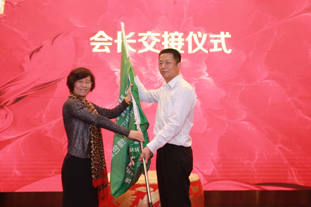 会长交接仪式上,协会创始会长叶青向新任会长代表戴立先传递协会会旗。